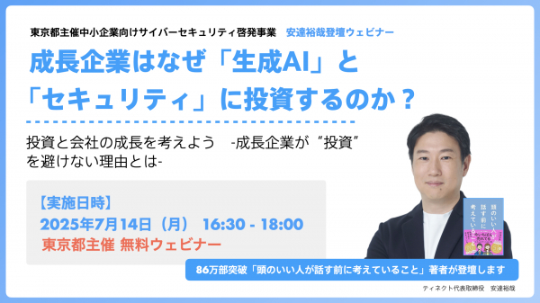 東京都中小企業サイバーセキュリティ啓発事業では、2025年7月14日(月)に、経営者向け特別セミナー兼事業説明会をオンラインで開催いたします。