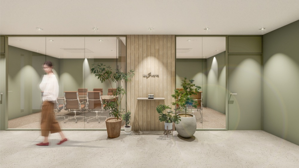 コンセプトカラーは、リーフワークスのコーポレートカラーのグリーンとそれに馴染むオレンジを差し色に。リーフワークス・グループがそれぞれの色を出しながら混ざり合い、イノベーションを起こす場として機能するよう設計しています。