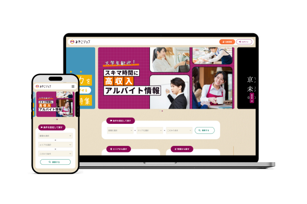 京都を例に、土地ならではの項目を揃えた地域限定求人サイト。地元企業とのつながりを深めやすいようファーストビューに特集を配置。検索は幅広い世代の方にお使いいただけるよう、UI / UXにこだわって設計しました。