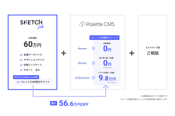 SKETCH jobは、PaaS型CMSのパレットCMSで構築しています。SKETCH jobの本体価格にパレットCMSの初期費用と月額費用が別途必要ですが、割引チケットでお得にご利用いただけます。