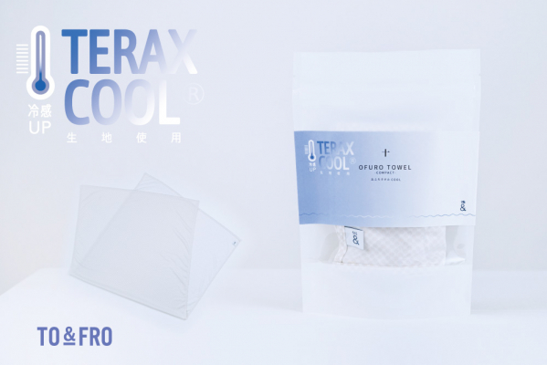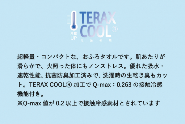 「おふろタオル-コンパクト- COOL」に採用したのは、TO&FROのファクトリーブランドとしての技術力を活かした、TERAXCOOL(R)加工つきの冷感ニット素材。TERAXCOOL(R)とは、太陽光の熱(近赤外線)を遮断し、衣服内の温度上昇を抑えるために開発された特殊加工で、Q-max値0.263という高い接触冷感性能を誇ります。これは、一般的に「触れた瞬間にひんやり」と感じる基準値0.2を大きく超える水準で、確かな涼しさを体感いただける数値です。