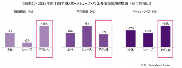 日本の2025年第1四半期のスポーツシューズ・アパレル市場規模は3591億円で、前年同期比388億円(12%)増でした(図表1)。内訳を見ると、特にアパレルが前年同期比15%増と大きく市場が拡大しました。アパレルでは、平均単価が5%上昇しているだけでなく、販売個数も10%と大きく増加しました。