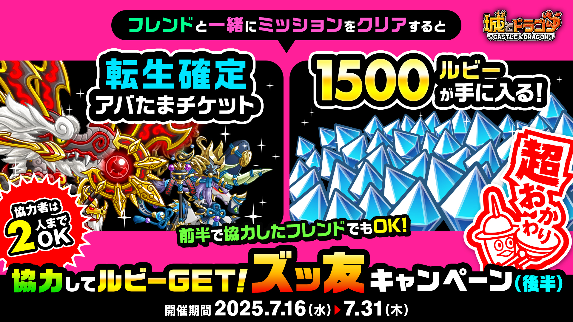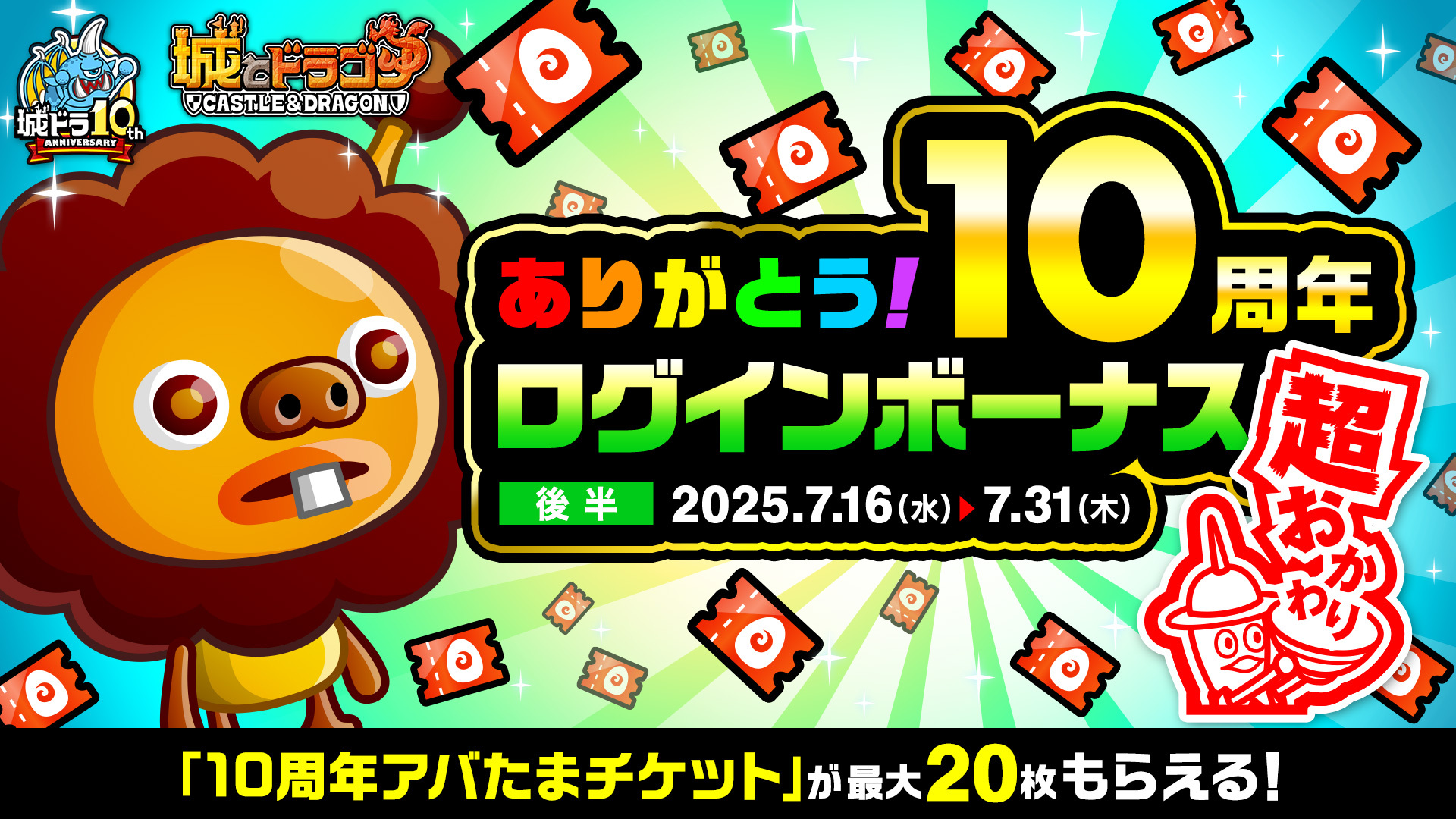 『城とドラゴン』で現在開催中の10.5周年キャンペーン「ありがとう10周年!城ドラ超感謝祭 超おかわり」の“後半”が、7月16日(水)0:00よりスタートします。特別なログインボーナスやミッションはもちろん、1日1回最大“10,100ルビー”が当たる!?「10周年ルビーアバたま」、最高“100,000ルビー”などが当たる「城ドラ宝くじ」が獲得可能なミッションも引き続き開催!さらに5日間で最大1,000ルビーを獲得できる「ルビー剣士登場ウィーク」や、厳選されたキャラがすくすく育つ「運営セレクト20キャラ超育成祭」も!10周年“超おかわり”の『城とドラゴン』で、ぜひお楽しみください。