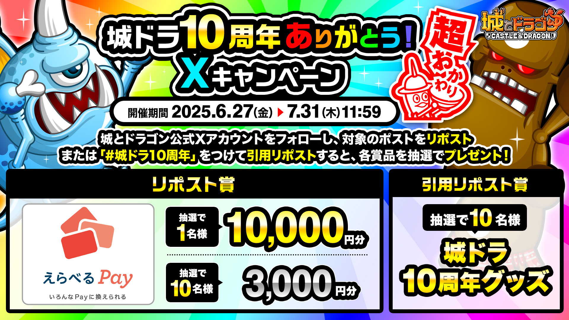 6月27日(金)より『城とドラゴン』10周年超おかわりを記念した「城ドラ10周年ありがとう!Xキャンペーン」を開催中!『城とドラゴン』公式Xアカウント(@shirotodoragon)をフォローし、対象ポストをリポストまたは「#城ドラ10周年」をつけて引用リポストしていただいた方の中から抽選で、各賞に応じて「えらべるPay(R)」や、「城ドラ10周年グッズ」をプレゼント!