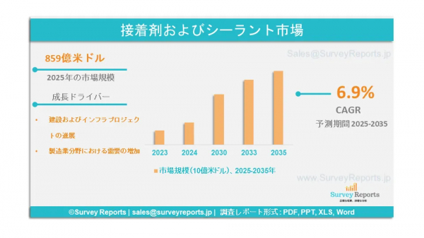 Survey Reports LLCは2025年7月に、**「接着剤およびシーラント市場のセグメンテーション:接着剤技術(水性、溶剤系、ホットメルト、反応型、その他)、接着剤の最終用途産業(紙・包装、建設、木工、消費者・DIY、自動車・輸送、皮革・履物、その他)、シーラント樹脂(シリコーン、ポリウレタン、エマルジョン、ポリスルフィド、その他)、シーラントの最終用途産業(建設、自動車・輸送、消費者、その他)―世界市場の分析、動向、機会および予測(2025年~2035年)」**という調査報告書を発表した。本報告書は、接着剤およびシーラント市場の予測評価を提供するものであり、市場の成長要因、市場機会、課題、脅威といった主要な市場ダイナミクスを明らかにしている。