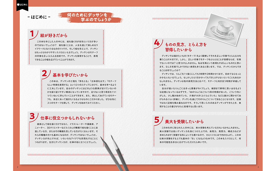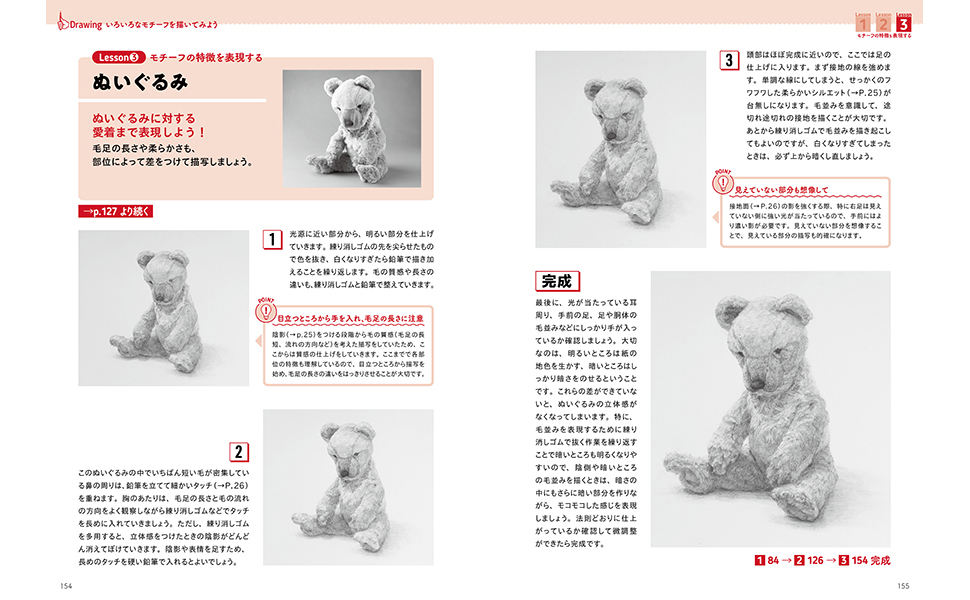 デッサンの本質的な技術を3ステップに分けてていねいに解説。読むほどに絵を描くための基礎となるデッサン力について理解が深まり、さらに順を追って練習することでデッサンに必要な技術を着実に身につけることができます。