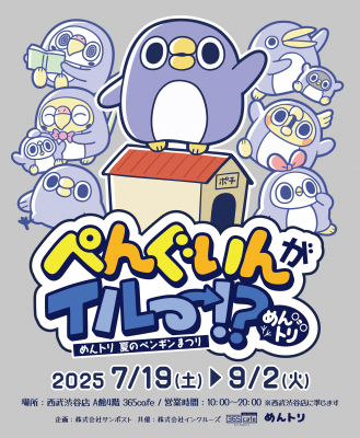 株式会社インクルーズ(東京都渋谷区、代表取締役社長 山﨑 健司)は、当社が提供するLINEスタンプ「面倒だがトリあえず返信」から生まれた「めんトリ」シリーズ内の大人気キャラクター「ぺんぐいん」を主役としたコラボカフェ「ぺんぐいんがイルー!? めんトリ 夏のペンギンまつり」が2025年7月19日(土)~2025年9月2日(火)に「365cafe 西武渋谷店」にて開催されることをご報告させていただきます。