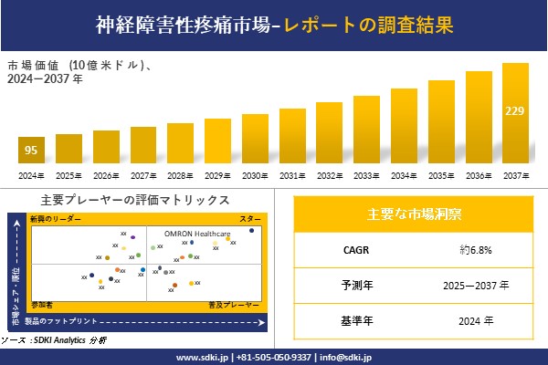 SDKI Analytics(本社:東京都渋谷区)は、このたび、2025年07月15に「神経障害性疼痛市場調査レポート:2025-2037年の市場規模、シェア、傾向の予測」を発表しました。神経障害性疼痛に関する市場調査レポートには、統計的及び分析的アプローチを使用した予測評価が含まれています。この調査レポートでは、一次及び二次調査方法を使用して分析された主要な業界洞察を通じて将来の傾向を理解できるようにすることで、主要な市場傾向を読者に説明しています。