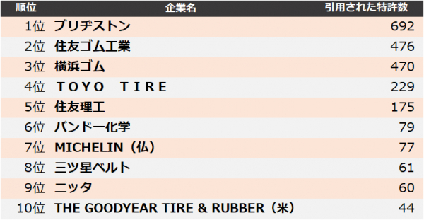 集計の結果、2024年に最も引用された企業は、1位 ブリヂストン、2位 住友ゴム工業、3位 横浜ゴムとなりました。