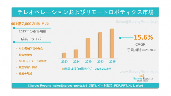 Survey Reports LLCは、2025年7月に『遠隔操作およびリモートロボティクス市場のセグメンテーション:構成要素別(ハードウェア、ソフトウェア)、機構別(可搬型、固定型)、技術別(人工知能、機械学習、仮想現実、拡張現実、シミュレーションおよびデジタルツイン技術)、エンドユーザー別(航空宇宙・防衛、食品・飲料、自動車・輸送、エネルギー・電力、鉱業・建設、小売・eコマース、その他)、用途別(ディスペンシング、溶接・穴あけ、積層造形、マシンテンディング、測定・検査、スタンピング、その他)―世界市場分析、動向、機会および予測(2025年~2035年)』という調査報告書を発表したと明らかにした。この報告書は、遠隔操作およびリモートロボティクス市場に関する予測評価を提供しており、成長要因、市場機会、課題、脅威といった主要な市場ダイナミクスを明らかにしている。