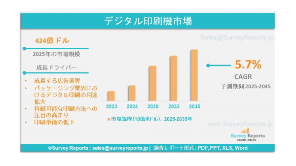 Survey Reports LLCは、2025年7月に『デジタル印刷機市場のセグメンテーション:印刷プロセス別(電子写真方式、インクジェット)、用途別(書籍、商業印刷、パッケージング〔ラベル、段ボール包装、カートン、軟包装、硬質プラスチック包装、金属包装〕)―世界市場分析、動向、機会および予測(2025年~2035年)』という調査報告書を発表したと明らかにした。この報告書は、デジタル印刷機市場に関する予測評価を提供しており、成長要因、市場機会、課題、脅威などの主要な市場ダイナミクスを明示している。
