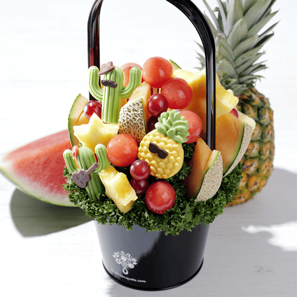 花のように咲いたフルーツに加え、爽やかなぶどうやサボテンやパイナップルのキュートなチョコレートも散りばめ、箱を開けた瞬間にお子さまの目が輝く“食べられる花束”です。