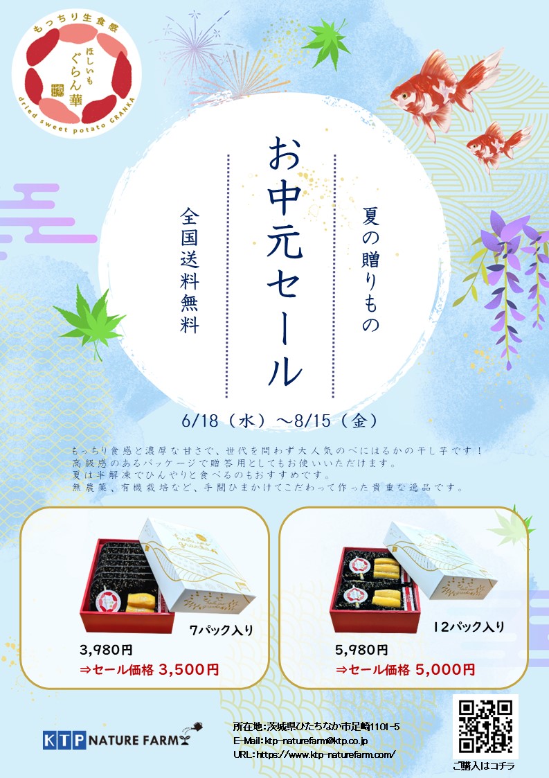KTPネイチャーファームでは、8月15日(金)まで半生ほしいも「ぐらん華」のお中元セールを開催しています。