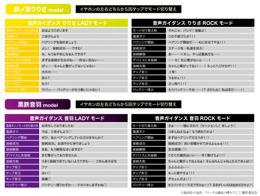 本コラボレーションモデルは「鈴ノ宮りりさ」「黒鉄音羽」の2モデル。充電ケース天面、左右ハウジング共に作品、各キャラクターをイメージしたアイコン・モチーフを配置。各キャラクターの新規録り下ろしボイスを搭載し、電源オンやオフ、ペアリング時やタップ音等のオリジナルボイスを「LADYモード」「ROCKモード」の2モード楽しむ事が可能です。パッケージは描き下ろしイラストデザインとなっております。