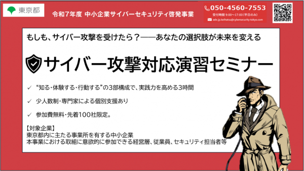 東京都が主催する「令和7年度中小企業サイバーセキュリティ啓発事業」では、都内中小企業の経営層・部門責任者・セキュリティ担当者を対象に、“体験型”のサイバー攻撃対応演習セミナーを開催しています。