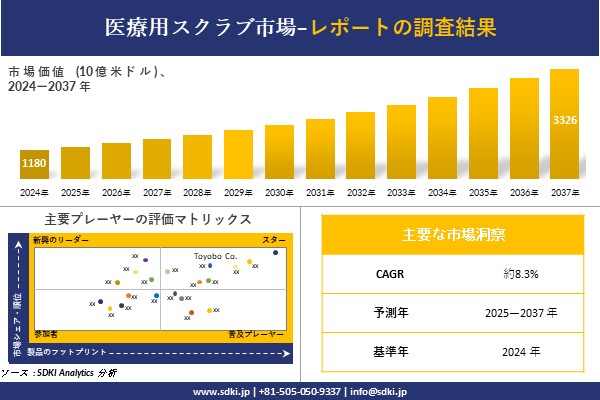 SDKI Analytics(本社:東京都渋谷区)は、このたび、2025年07月17に「医療用スクラブ市場調査レポート:2025-2037年の市場規模、シェア、傾向の予測」を発表しました。医療用スクラブに関する市場調査レポートには、統計的及び分析的アプローチを使用した予測評価が含まれています。この調査レポートでは、一次及び二次調査方法を使用して分析された主要な業界洞察を通じて将来の傾向を理解できるようにすることで、主要な市場動向を読者に説明しています。