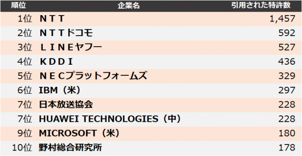 情報通信業界の被引用件数上位50社のランキング