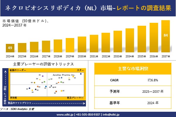 SDKI Analytics(本社:東京都渋谷区)は、このたび、2025年07月18に「ネクロビオシス リポディカ (NL)市場調査レポート:2025-2037年の市場規模、シェア、傾向の予測」を発表しました。ネクロビオシス リポディカ (NL)に関する市場調査レポートには、統計的及び分析的アプローチを使用した予測評価が含まれています。この調査レポートでは、一次及び二次調査方法を使用して分析された主要な業界洞察を通じて将来の傾向を理解できるようにすることで、主要な市場動向を読者に説明しています。