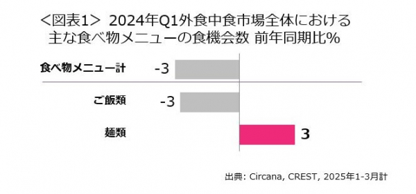 2025年第1四半期(1-3月計)の外食・中食市場全体において、食べ物計の食機会数は前年同期比3%減でした。その中で、麺類計は増加しており、同3%増でした(図表1)。一方で、ご飯類計は、同3%減でした。