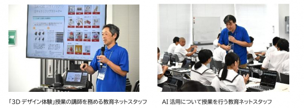 期間中、金沢市立中学校8校の2年生の生徒たちが参加し、延べ約1,600名がAI活用や3Dデザインといった先端技術を体験しながら学びを深めました。教育ネットは体験授業のコンテンツ制作と授業講師を担当。「3Dデザイン体験」授業では、ものづくりに対する考え方、3Dモデリングの体験、3Dプリンターが活用されているさまざまなシーンの理解を通し、著作権・意匠権に関する法律、環境問題などについて学習しながら、簡易的な3DCADを使って各自のネームタグをデザインしたほか、VRゴーグルを使用して仮想空間の体験も行いました。