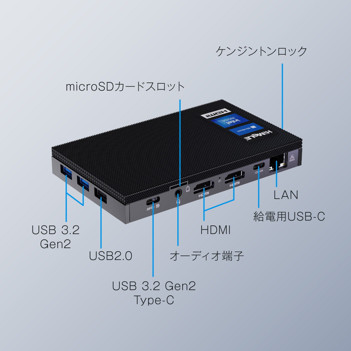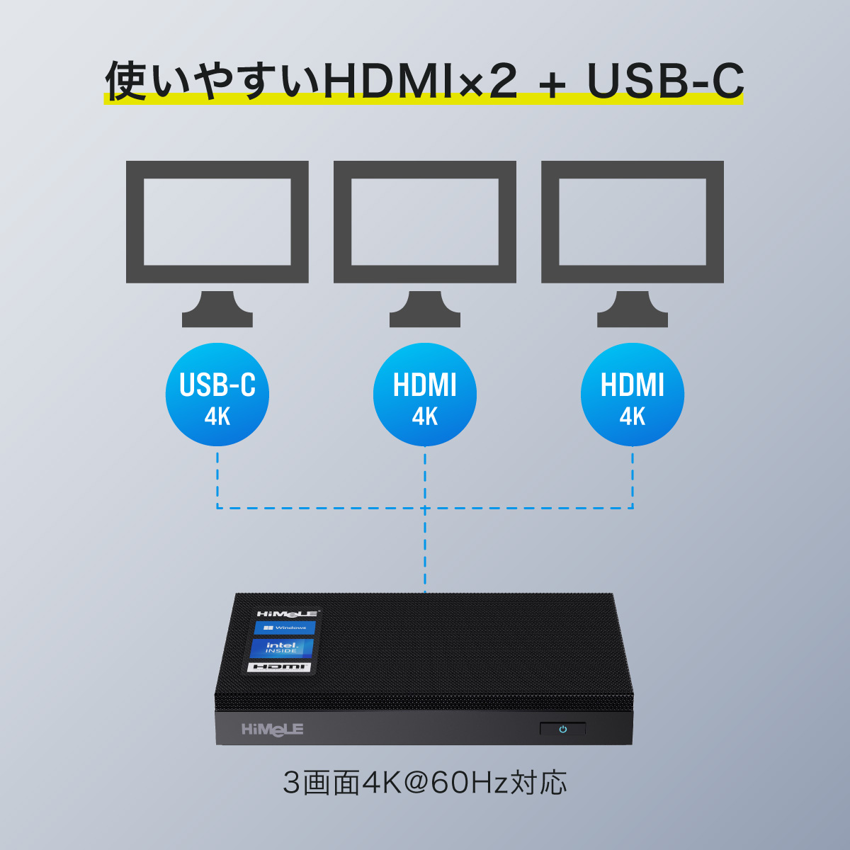 HiMeLE Quieter 4Cは、Intel(R) Processor N150を搭載したファンレス極薄のミニPCです。わずか18.3 mmの薄さでありながら4コア4スレッド、最大3.6 GHz動作の高性能CPUと16 GBの大容量メインメモリ、512 GBのM.2 PCIe 3.0 高速SSDを搭載しています。HDMIとUSB-C端子を組み合わせて最大3画面同時出力が可能なため、最小限のスペースでマルチモニタ環境の構築にも対応します。