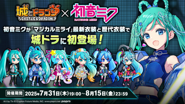 株式会社アソビズム(本社:東京都千代田区、代表取締役:大手智之)は、App Store・Google Playにて好評配信中の『城とドラゴン』で、『初音ミク』との初のコラボイベントを2025年7月31日(木)より開催することをお知らせいたします。
