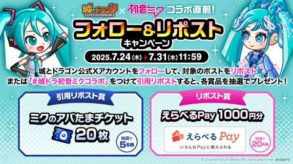 コラボ開催を記念して、「コラボ直前!フォロー&リポストキャンペーン」を実施いたします。『城とドラゴン』公式Xアカウント(@shirotodoragon)をフォローし、キャンペーン対象ポストをリポスト、またはハッシュタグ「#城ドラ初音ミクコラボ」をつけて引用リポストされた方の中から抽選で各賞品をプレゼント!ぜひ引用リポストする際はハッシュタグとあわせて、「コラボイベントが発表された時の感想」や「コラボイベントの楽しみにしているポイント」などもコメントしてみてください!