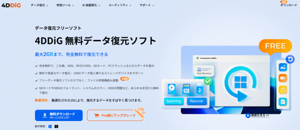 Tenorshare 4DDiGはデータ復旧の専門家です。WindowsとMacに対応しており、様々な状況で失われたデータを復元することができます。AI技術を使用して、失われた動画や破損した動画を復元可能です。