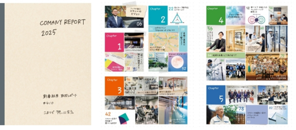 当社は「間づくりでEmpower all Lifeを実現する」というビジョンを掲げ、パーティションを主軸とした間づくりによる事業を展開していますが、COMANY REPORT 2025は、これまで当社が発行してきた従来の統合報告書とは異なり、読者へ「間づくり」の魅力を伝える内容となっております。冊子全体は取材者が間づくりをレポートにまとめる過程で記録した取材ノートのような構成となっています。表紙はノート風、文章には手書き風の文字を使用、掲載写真もインスタントカメラの写真も織り交ぜた記録を主とした雰囲気や、気づいたメモなどを写真と一緒に取材ノートに貼り付けたようなデザインとなっています。