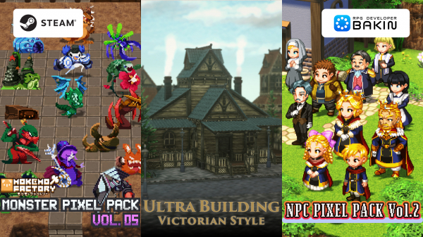 クラシックなビクトリア様式の街並みを構築できる3Dモデルパック『Ultra Building Victorian Style』、個性豊かなバトル用モンスターのドット絵素材集『Mokemo Factory MONSTER PIXEL PACK Vol.5』、標準素材のサポートキャラクターを高解像度で再構築したドット絵キャラクター素材集『Vibrato NPC PIXEL PACK Vol.2』を2025年7月30日(水)に発売予定です。