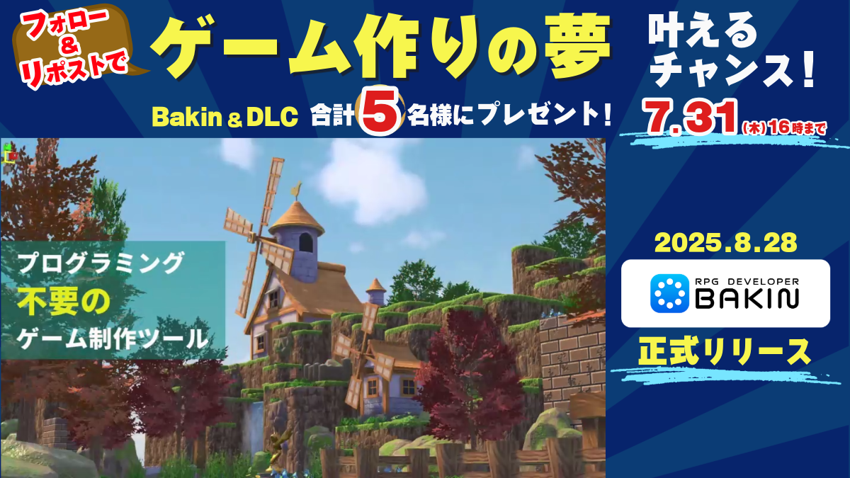 Bakinの公式SNSのアカウントをフォロー、キャンペーンの投稿をリポストすると抽選で各SNS×5名、合計10名様に『RPG Developer Bakin』やDLCをプレゼントします。さらに該当の投稿に「Bakinであなたが作りたいゲーム」 を返信すると当選確率がUPしますので、ぜひ、お気軽にご参加ください。