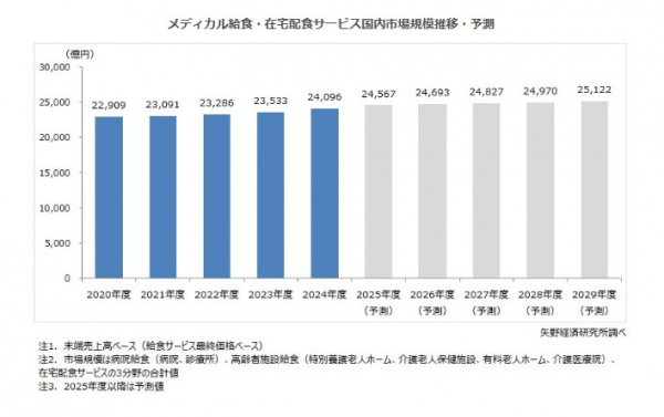 2024年度の国内メディカル給食、在宅配食サービス市場規模(病院給食、高齢者施設給食、在宅配食サービスの合計値)は前年度比102.4%の2兆4,096億円となった。