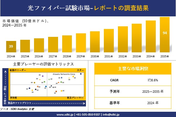 SDKI Analytics(本社:東京都渋谷区)は、このたび、2025年07月25に「光ファイバー試験市場調査レポート:2025-2035年の市場規模、シェア、傾向の予測」を発表しました。光ファイバー試験に関する市場調査レポートには、統計的及び分析的アプローチを使用した予測評価が含まれています。この調査レポートでは、一次及び二次調査方法を使用して分析された主要な業界洞察を通じて将来の傾向を理解できるようにすることで、主要な市場動向を読者に説明しています。