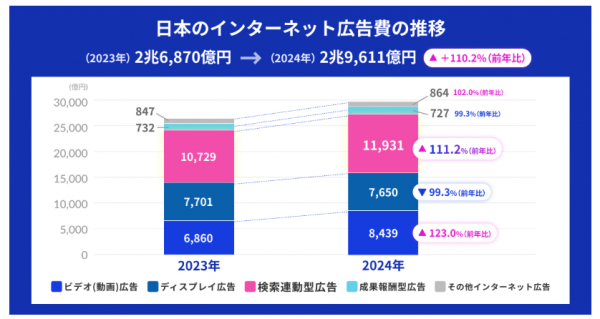 2024年度のインターネット広告媒体費は2兆9,611億円(前年比110.2%)、そのうち1兆1,931億円(40.3%)が検索連動型広告 (*1) となっています。