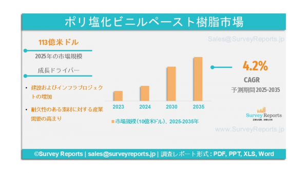 Survey Reports LLCは、2025年7月に調査報告書『ポリ塩化ビニルペースト樹脂市場のセグメンテーション:製造プロセス別(マイクロサスペンション法およびエマルジョン法)、グレード別(高K値グレード、中K値グレード、低K値グレード、酢酸ビニル共重合体グレード、ブレンド樹脂グレード)、最終用途産業別(自動車、建設、電子機器、包装)-世界市場分析、動向、機会および予測(2025~2035年)』を発表した。本報告書は、ポリ塩化ビニルペースト樹脂市場の予測評価を提供し、成長要因、市場機会、課題、および脅威といった主要な市場ダイナミクスを強調している。