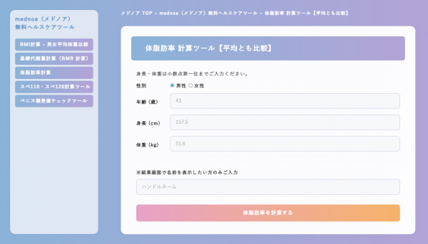 Hospitality Marketing Limitedは、体脂肪率を簡単に計算できる無料ツール『体脂肪率 計算ツール( https://mednoa.com/tools/taisibouritu-keisan )』を日常の健康管理に役立つ無料ツール集『mednoa(メドノア)無料ヘルスケアツール( https://mednoa.com/tools )』にて、2025年7月29日に公開いたしました。