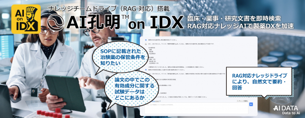 企業データとAIの利活用カンパニー、AIデータ株式会社(本社:東京都港区、代表取締役社長 佐々木隆仁、以下AIデータ社)は、製薬・バイオ業界における研究開発・臨床・薬事申請など高度かつ複雑な知識業務を支援するAIナレッジソリューション「AI孔明 on IDX」において、RAG(検索拡張生成)対応ナレッジチームドライブ搭載版の製薬・バイオ業界向け提供を開始いたしました。