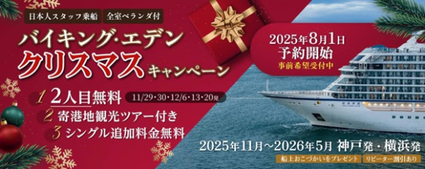 クルーズ予約サイト「ベストワンクルーズ」運営の株式会社ベストワンドットコム(本社:東京都新宿区、代表取締役:澤田秀太、野本洋平)は、8/1(金)より、バイキング・エデンにて実施するクリスマスクルーズの新キャンペーン適用での販売を数量限定で行いますのでお知らせいたします。なお、本日より事前希望受付を行います。