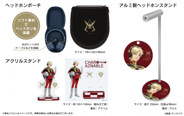 本コラボレーションモデルはジオン公国軍「シャア・アズナブル」専用モデル。右側アルミ製ハウジングプレートに「ジオン公国のイメージモチーフ」、左側アルミ製ハウジングプレートに「シャア・アズナブル」のエンブレムを配置。新規録り下ろし音声ガイダンスは電源オンやオフ、ペアリング時やタップ音等、計15ワードのボイスを搭載。ヘッドホンパッケージは描き下ろしイラストデザインとなっております。