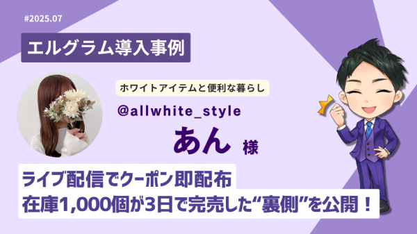 インスタライブ配信中に視聴者が特定のキーワードをコメントすると、エルグラムが自動でクーポンをDM送信する仕組みを活用しました。