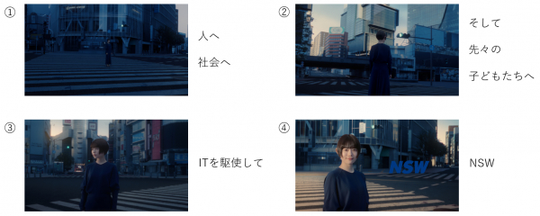 夜明け直前の渋谷スクランブル交差点で、ひとり佇む杉咲さんを中心にカメラが回ります。技術や文化の進化とともに、世界がまた一歩先の未来に生まれ変わっていくように、夜明けに向けて、街全体がだんだんと明るくなっていきます。杉咲さんの「人へ 社会へ そして 先々の子どもたちへ ITを駆使して」というナレーションは、NSWの企業理念である「Humanware by Systemware」とシンクロするものです。動画の最後の杉咲さんの穏やかで前向きな表情は、ITの力で豊かな未来を実現するという強い意思を反映しています。
