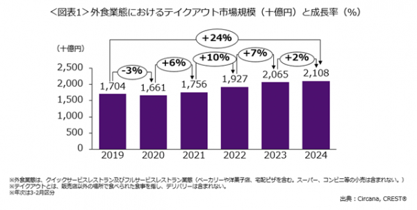 日本でコロナウイルス感染の影響が出始めた2020年3月を起点に3月-2月を1年と区切り、外食業態におけるテイクアウト市場規模をみると(図表1)、2024年は2兆1075億円となり、コロナ前の2019年比で24%増と大きく成長しました。前年同期比は2%増で、2022年の10%増をピークに伸び率は鈍化傾向にありますが、依然成長が続いている事が分かります。