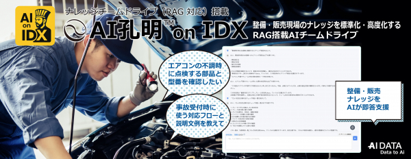 企業データとAIの利活用カンパニー、AIデータ株式会社(本社:東京都港区、代表取締役社長 佐々木隆仁、以下AIデータ社)は、自動車整備・販売業界における車両メンテナンス、部品交換、事故対応、営業提案などの業務を支援する業界特化型生成AIソリューション「AI孔明 on IDX」において、RAG(検索拡張生成)対応ナレッジチームドライブ搭載版を、全国のディーラー・整備工場・販売会社向けにリリースいたしました。