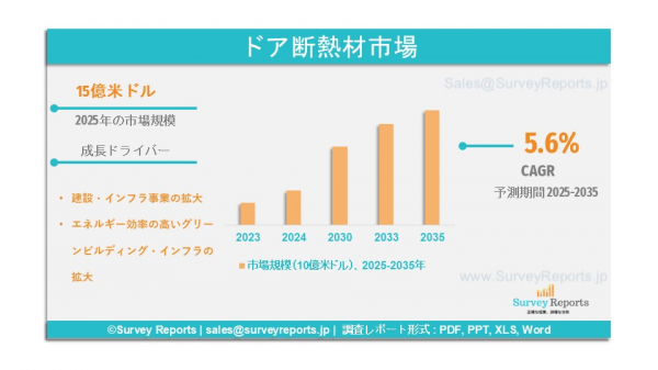 Survey Reports LLCは、2025年7月に調査報告書『ドア断熱材市場のセグメンテーション:素材タイプ(ポリウレタンフォーム、ポリスチレンフォーム、グラスファイバー、鉱物ウール、複合材料)、用途(住宅用ドア、商業用ドア、産業用ドア、ガレージドア)、厚さ(1インチ、2インチ、3インチ、4インチ)、最終用途(新築、改修)による分析 ― 世界市場分析、動向、機会、予測(2025年~2035年)』を発表した。本報告書は、ドア断熱材市場の予測評価を提供し、成長要因、市場機会、課題、脅威など、複数の主要な市場ダイナミクスを強調している。