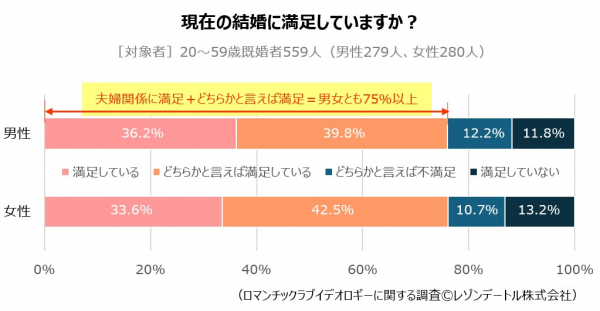 今回の調査により、令和日本の夫婦関係は意外に強固であることが判明しました。75%以上、つまり4人に3人の既婚者は自分の結婚に満足しています。また、6割以上の既婚者がパートナーに愛があり、パートナーからの愛も感じていることが分かりました。