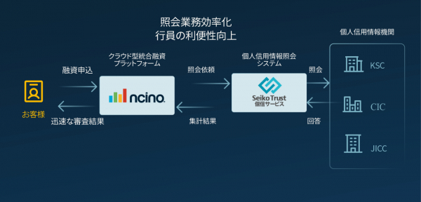 本連携では、nCinoが提供する融資業務プラットフォームと、セイコーソリューションズが提供する「Seiko Trust 個信サービス」を接続し、融資業務における審査プロセスで個人信用情報を自動的に取り込むことが可能になります。照会業務の自動化により、金融機関における個人向けローン審査に関わる事務作業を大幅に削減し、行員の利便性向上と審査時間の短縮を実現します。