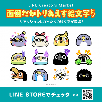 今後もLINEスタンプだけでなく、LINE着せかえやLINE絵文字に加え、「カワセル」及び「カワセルくじ」や「インクルーズプリント」でのフィジカルグッズ化など幅広く展開しますので、「面倒だがトリあえず返信」から生まれた「めんトリ」をトリあえず応援の程、宜しくお願い致します。