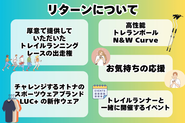 実施に向けて、すでに多くのトレイルランニング関係者から賛同をいただいております。「FunTrails」の代表でもある奥宮俊祐選手や、トレイルランナーの丹羽薫選手をはじめとした日本のトップランナーからも応援をいただき、リターンの提供にご協力いただいております。現時点でもご協力のお申し出をいただいており、リターンを随時追加しています。皆様の応援に大変感謝しております。