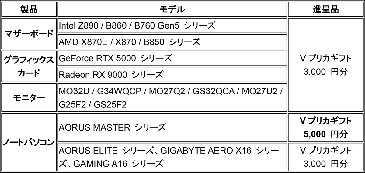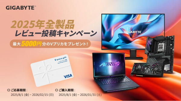 高品質マザーボード及び、グラフィックスカード等のハードウェア製品メーカーであるGIGABYTE Technology Co., Ltd. は、2025年8月1日(金)から2026年1月31日(土)までの期間で、対象製品をご購入してレビューを投稿すると、最大5,000円分のVプリカが貰える「2025年全製品レビューキャンペーン」を開催いたします。