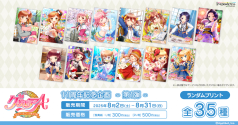 株式会社インクルーズ(東京都渋谷区、代表取締役社長 山﨑 健司)は、8月2日(土)より、日本全国のコンビニエンスストア店内のマルチコピー機を中心に、気軽にプリントできる「インクルーズプリント by eプリントサービス」にて「グリモアA ~私立グリモワール魔法学園~」11周年を記念したコンテンツプリントの第1弾がランダム式で販売開始したことをご報告させていただきます。